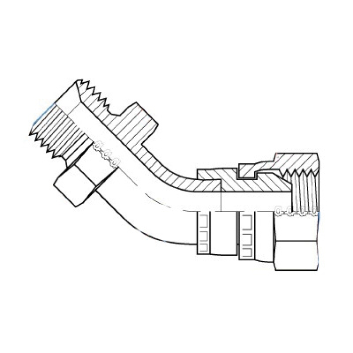 Adaptall 45 deg Elbow, Series: 9047, Connection Type 1: BSPP 60 deg Flare, Gender 1: Male, Connection Size 1: 1/2 in, Thread Size 1: G 1/2-14, Connection Type 2: BSPP 60 deg Flare Swivel, Gender 2: Female, Connection Size 2: 1/2 in, Thread Size 2: G 1/2-14, Hex Size: 27 mm, Dimension Standards: BS 5200, ISO 1179, ISO 8434-6, Material Construction: Carbon Steel