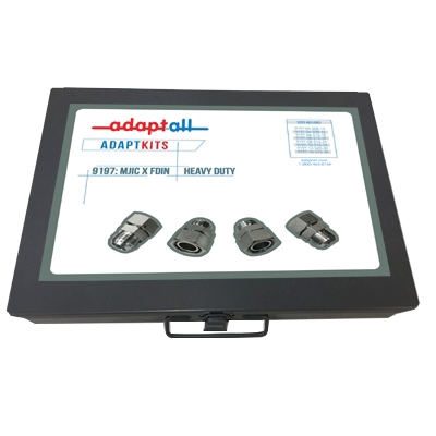 The 9197 Heavy Kit is a convenient mix of male JIC x female DIN DKO sizes to keep on hand for a variety of applications, you can either sell the entire kit, a few fittings at a time or use them in your shop or retail environment as a Fitting Identification tool. Comes in durable metal case and fully labeled for convenience.