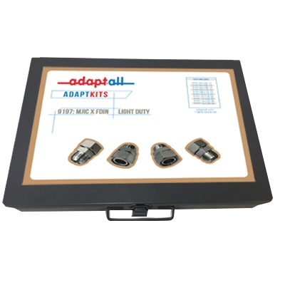 The 9197 Light Kit is a convenient mix of male JIC x female DIN DKO sizes to keep on hand for a variety of applications, you can either sell the entire kit, a few fittings at a time or use them in your shop or retail environment as a Fitting Identification tool. Comes in durable metal case and fully labeled for convenience.