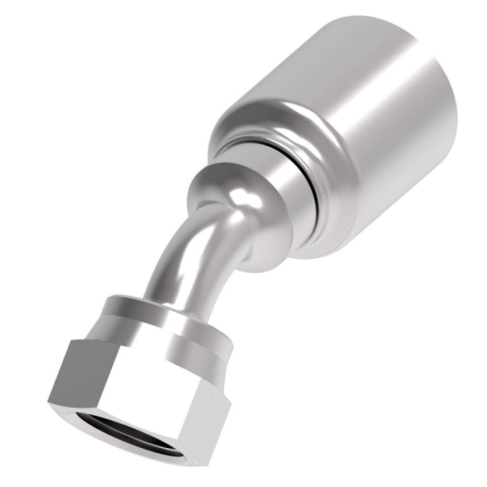 Aeroquip® Crimp Hose 45 deg Elbow, Series: 4T, Fitting Type: 45 deg Elbow, Connection Size 1: 1/4 in, Connection Type 1: Hose, Connection Size 2: 1/4 in, Connection Type 2: Female ORFS Swivel, Hose Dash Size: 04, Cut-Off Factor: 1.19 in, Material Construction: Carbon Steel, 9/16-18 Thread, 0.69 in Hex, For Use With: Thermoplastic Hoses, 2.88 in L x 0.826 in W x 1.32 in H