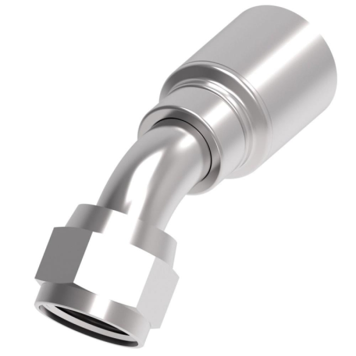 Aeroquip® Crimp Hose 45 deg Elbow, Series: 4T, Fitting Type: 45 deg Elbow, Connection Size 1: 3/8 in, Connection Type 1: Hose, Connection Size 2: 3/8 in, Connection Type 2: Female 37 deg JIC Swivel, Hose Dash Size: 06, Cut-Off Factor: 1.31 in, Material Construction: Carbon Steel, 9/16-18 Thread, 11/16 in Hex, For Use With: Thermoplastic Hoses, 2.65 in L x 0.962 in W x 1.214 in H