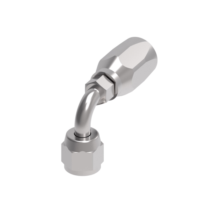 Aeroquip® by Danfoss 100R5 Reusable 90 deg Short Elbow, Series: 190302, Connection Type 1: Hose, Connection Size 1: 3/4 in, Hose Dash Size: 12, Connection Type 2: SAE 45 deg Swivel, Gender 2: Female, Connection Size 2: 3/4 in, Nominal Size: 3/4 in, Thread Size 2: 1-1/16-14, Hex Size: 1-1/4 x 1-1/4 in, 1500 psi at 70 deg F, Cut-Off Factor: 2.17 in, Material Construction: Carbon Steel, Finish: Dura-Kote, For Use With: 1503, 2580, 2651, FC234, FC300, FC321, FC350, FC355, and FC802 Series Hoses, Dimensions: 3.74 in L