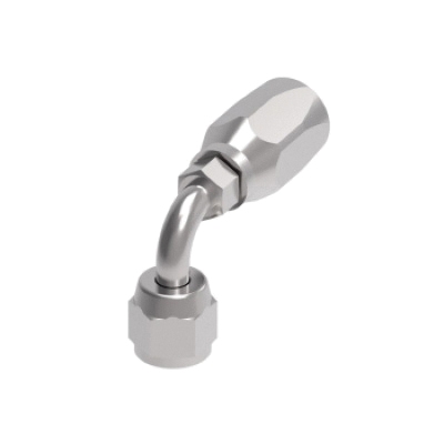 Aeroquip® by Danfoss 100R5 Reusable 90 deg Short Elbow, Series: 190302, Connection Type 1: Hose, Connection Size 1: 3/8 in, Hose Dash Size: 06, Connection Type 2: SAE 45 deg Swivel, Gender 2: Female, Connection Size 2: 3/8 in, Nominal Size: 3/8 in, Thread Size 2: 5/8-18, Hex Size: 0.75 x 0.81 in, Cut-Off Factor: 1.23 in, Material Construction: Carbon Steel, Finish: Dura-Kote, For Use With: 1503, 2580, 2651, FC234, FC300, FC321, FC350, FC355, and FC802 Series Hoses, Dimensions: 2.5 in L x 0.81 in W x 1.68 in H