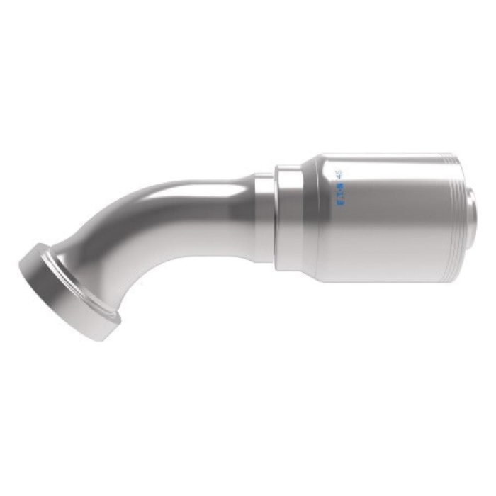 Aeroquip® by Danfoss 4-Spiral Crimp Hose 45 deg Elbow, Series: 4S, Connection Type 1: Hose, Connection Size 1: 1-1/2 in, Hose Dash Size: 24, Connection Type 2: Flange, Connection Size 2: 1-1/2 in, Cut-Off Factor: 5.4 in, Material Construction: Carbon Steel, Finish: Dura-Kote, For Use With: EC525-12 to -32, GH493-12 to -32, FC636-12 to -32, FC736-12 to -32, FC500-12 to -24, FC273B-12 and -16, GH506-12 to -32, FC254-12 to -32, EC810-12 and -16, EC600-12 and -16, H430-12 to -32, H430R-12 to -32, EC525-12 to -32, H471-12 to -24, H464-12 to -32, and H485-16 Hoses, Dimensions: 9.722 in L x 2.823 in W x 3.23 in H, Dimension Standards: SAE J1176