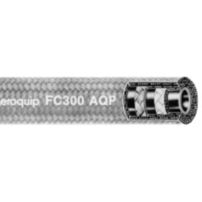The Aeroquip® FC300 Series Engine and Fuel Hose is engineered for robust performance in demanding applications. Featuring an AQP elastomer tube, polyester inner braid, single wire braid reinforcement, and a blue polyester braided cover, this hose ensures durability and flexibility. It is designed to handle a variety of fluids, including petroleum-based fluids, air, gasoline, fuel, lubricating oils, fire-resistant hydraulic fluids, and other industrial substances. The hose operates effectively within a temperature range of -55°F to 212°F, with air applications not exceeding 250°F. It meets SAE J1402 standards, ensuring compliance with industry requirements. The hose's construction provides excellent abrasion resistance, contributing to a longer service life. With a bend radius of 13-1/4 inches, it offers flexibility for various installation configurations.