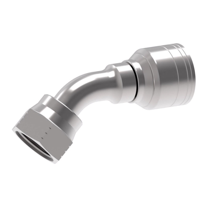 Aeroquip® 100R14 Super Gem Reusable 45 deg Elbow, Series: FC9341, Connection Type 1: Hose, Connection Size 1: 3/8 in, Hose Dash Size: 06, Connection Type 2: SAE 45 deg Swivel, Gender 2: Female, Connection Size 2: 3/8 in, Material Construction: Carbon Steel, Finish: Dura-Kote, Dimensions: 1.2 in L x 0.39 in H