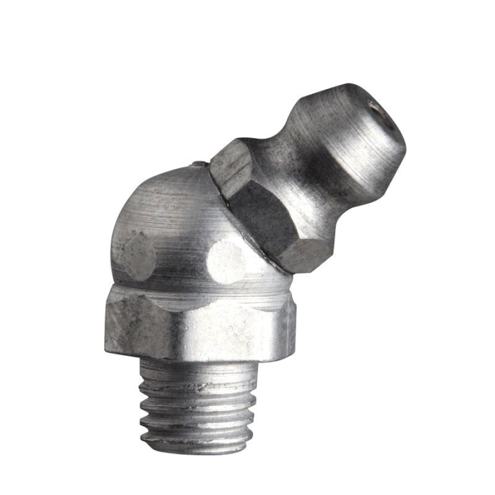 AlemiteĀ® 45 deg Zerk Grease Fitting, Connection Size 1: 1/4-28 UNF, Connection Type 1: Taper Threaded, Finish: Zinc-Plated, 13/64 in Length Shank, Hex Size: 3/8 in, Check Valve Type: Ball, 13/16 in Length