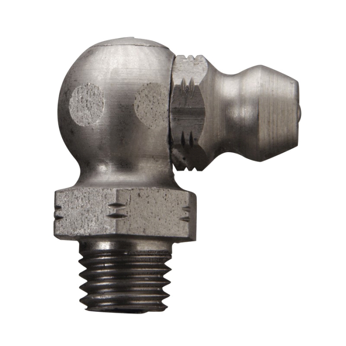 Alemite® Hydraulic 90 deg Grease Fitting, Connection Size 1: 1/4-28 UNF, Connection Type 1: Taper Threaded, Material Construction: Stainless Steel, 13/64 in Length Shank, 7/64 in Length Thread, Hex Size: 3/8 in, Check Valve Type: Ball, 3/4 in Length