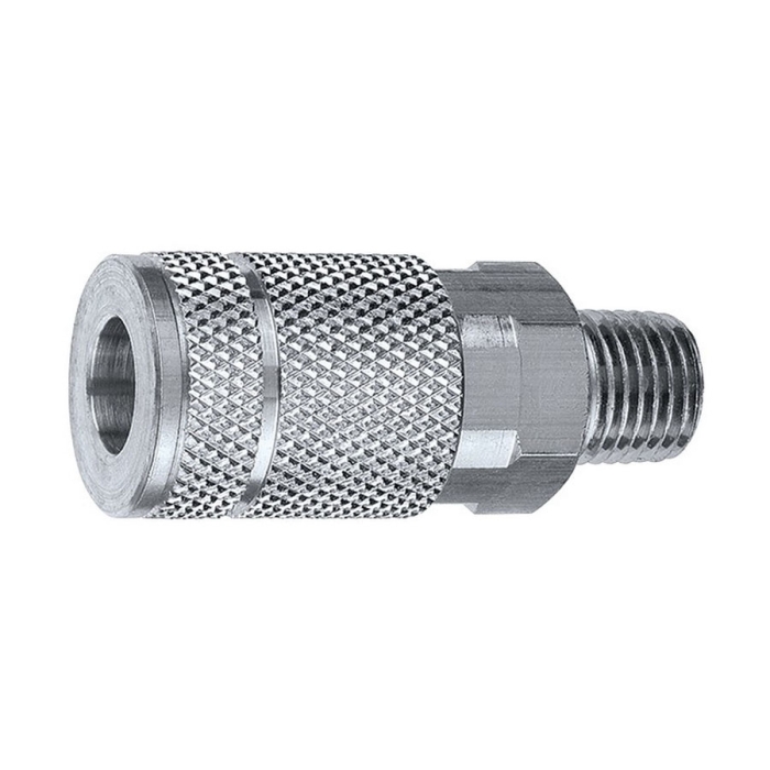 Amflo® Coupler, Series: T Design, Connection Type 1: Quick Connect, Connection Size 1: 3/8 in, Connection Type 2: NPT, Gender 2: Male, Connection Size 2: 1/4 in, 300 psi, Material Construction: Steel, For Use With: Compressed Air Lines