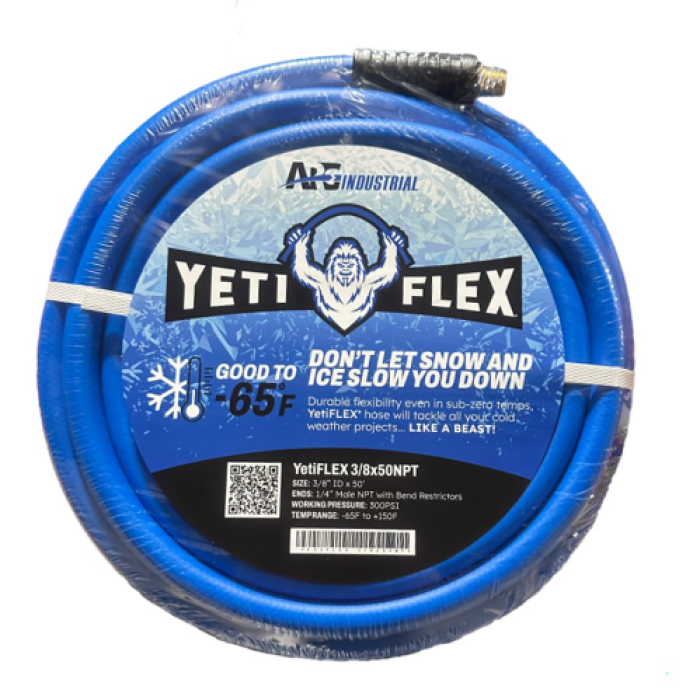 YETIFLEX ™ is a tough, flexible hose made from high-grade PVC resin, designed for superior performance in cold weather air tool applications. With a 300 psi rating, it handles -65 to 150°F. It resists deformation, features a non-marking cover, is lightweight, and medium oil resistant. Ideal for cold weather, in-plant, and freezer applications.