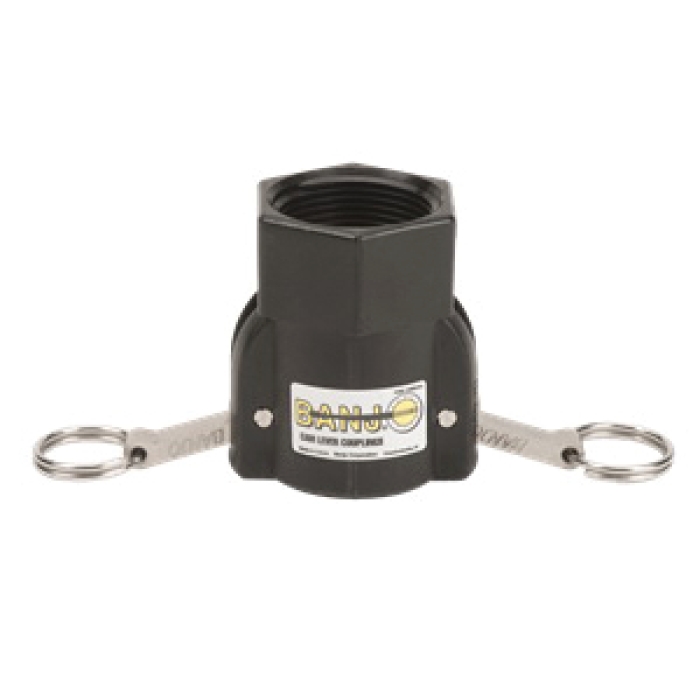 Banjo® Cam Lever Coupling, Connection Type 1: Type D, Gender 1: Female, Connection Size 1: 1-1/4 in, Connection Type 2: NPT, Gender 2: Female, Connection Size 2: 1-1/4 in, 300 psi, Material Construction: Glass Filled Polypropylene, Dimensions: 1-31/32 in Dia x 2-7/8 in L