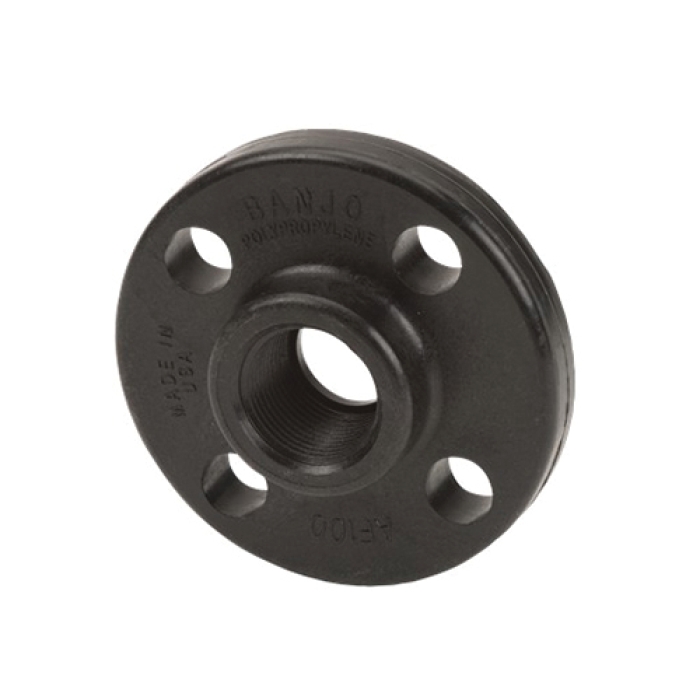 Banjo® Heavy-Duty ANSI Flange, Connection Type 1: NPT, Gender 1: Female, Connection Size 1: 1 in, 150 lb, 5/8 in Bolt Hole Diameter, 4 -Bolt Hole, 5/8 in Thick Flange, Material Construction: Glass Reinforced Polypropylene, Black, SCH 80, Dimensions: 4-1/4 in OD, -20 to 150 deg F