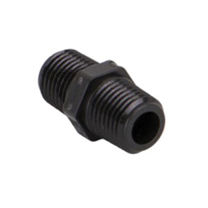 Banjo® Close Short Pipe Nipple, Connection Type 1: NPT, Gender 1: Male, Connection Size 1: 1/4 in, Thread Size 1: 1/4-18, Connection Type 2: NPT, Gender 2: Male, Connection Size 2: 1/4 in, Thread Size 2: 1/4-18, SCH 80, 300 psi, Material Construction: Glass Reinforced Polypropylene, Black, 9/32 in ID Diameter, Close Length, Hex Size: 5/8 in, -20 to 150 deg F