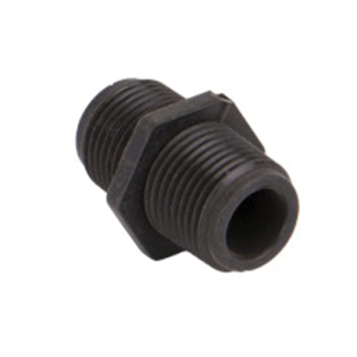 Banjo® Close Short Pipe Nipple, Connection Type 1: NPT, Gender 1: Male, Connection Size 1: 3/8 in, Thread Size 1: 3/8-18, Connection Type 2: NPT, Gender 2: Male, Connection Size 2: 3/8 in, Thread Size 2: 3/8-18, SCH 80, 300 psi, Material Construction: Glass Reinforced Polypropylene, Black, 12/32 in ID Diameter, 1-1/4 in Length, Hex Size: 7/8 in, -20 to 150 deg F