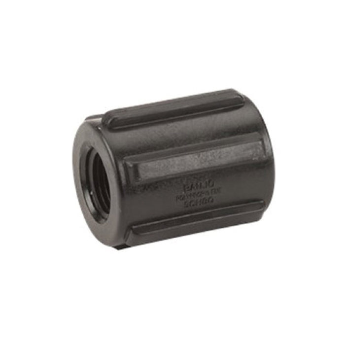 Banjo® Pipe Coupling, Connection Type 1: NPT, Gender 1: Female, Connection Size 1: 1/2 in, Connection Type 2: NPT, Gender 2: Female, Connection Size 2: 1/2 in, 300 psi, SCH 80, Material Construction: Glass Reinforced Polypropylene, Black, Dimensions: 2 in L, -20 to 150 deg F