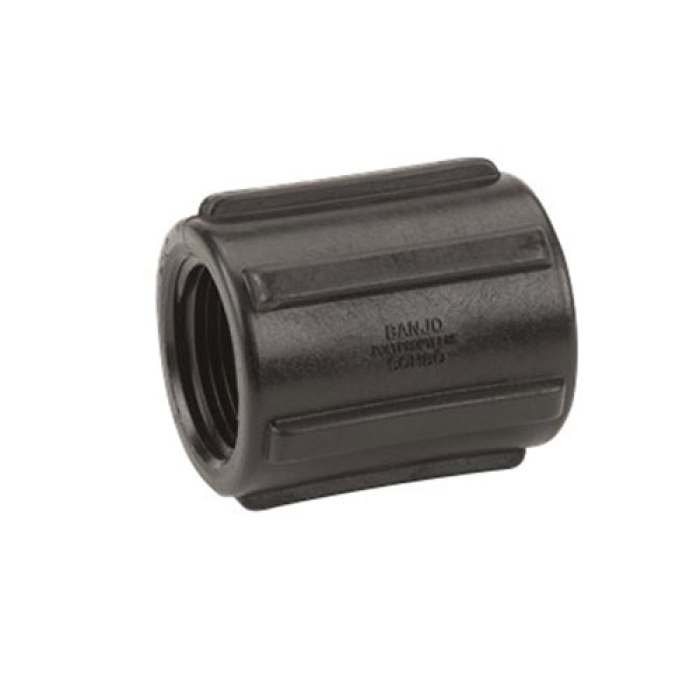 Banjo® Pipe Coupling, Connection Type 1: NPT, Gender 1: Female, Connection Size 1: 3/4 in, Connection Type 2: NPT, Gender 2: Female, Connection Size 2: 3/4 in, 300 psi, SCH 80, Material Construction: Glass Reinforced Polypropylene, Black, Dimensions: 2 in L, -20 to 150 deg F