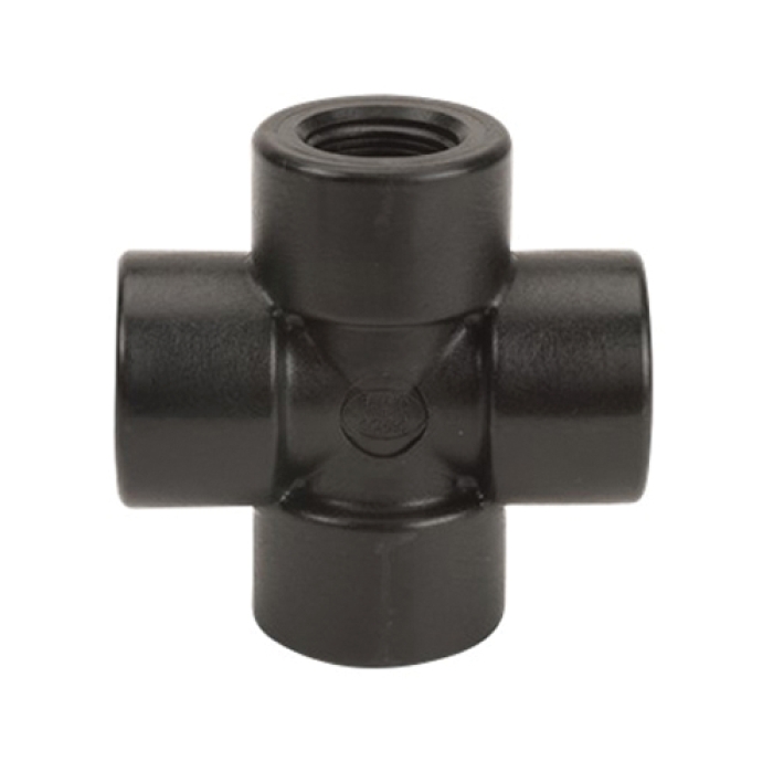 Banjo® Pipe Cross, Connection Type 1: NPT, Gender 1: Female, Connection Size 1: 3/4 in, Thread Size 1: 3/4-14, Connection Type 2: NPT, Gender 2: Female, Connection Size 2: 3/4 in, Thread Size 2: 3/4-14, Connection Type 3: NPT, Gender 3: Female, Connection Size 3: 3/4 in, Thread Size 3: 3/4-14, Connection Type 4: NPT, Gender 4: Female, Connection Size 4: 3/4 in, Thread Size 4: 3/4-14, SCH 80, 300 psi, Material Construction: Glass Reinforced Polypropylene, Black, Dimensions: 3-11/16 in L, -20 to 150 deg F