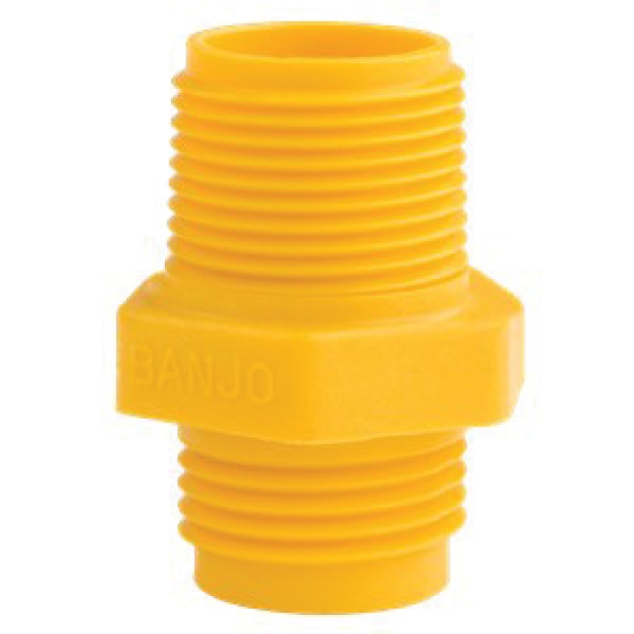 Banjo® Cam Lever Coupling, Connection Type 1: NPT, Gender 1: Male, Connection Size 1: 3/4 in, Connection Type 2: GHT, Gender 2: Male, Connection Size 2: 3/4 in, 300 psi, Material Construction: Fiberglass Reinforced Polypropylene, Yellow, Dimensions: 2 in L x 1-13/32 in W, For Use With: Garden Hose Fitting