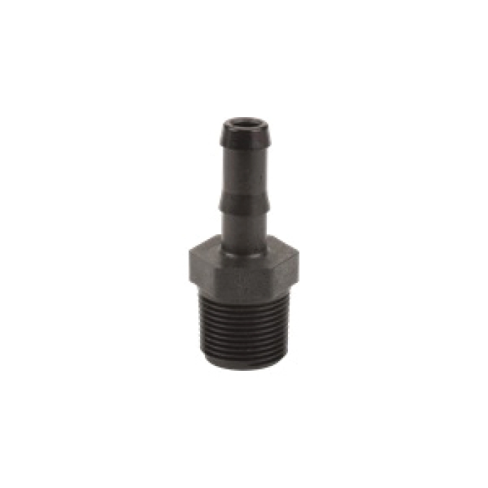 Banjo® Straight Adapter, Connection Type 1: NPT, Gender 1: Male, Connection Size 1: 3/4 in, Thread Size 1: 3/4-14, Connection Type 2: Hose Barb, Connection Size 2: 1/2 in, Hex Size: 1-1/8 in, 300 psi, Material Construction: Glass Reinforced Polypropylene, Black, Dimensions: 2-13/16 in L, -20 to 150 deg F
