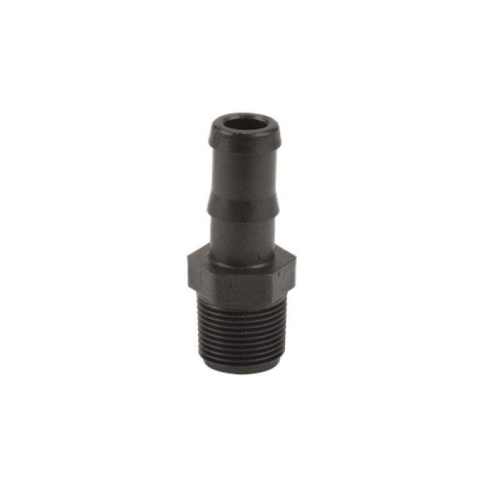 Banjo® Straight Adapter, Connection Type 1: NPT, Gender 1: Male, Connection Size 1: 3/4 in, Thread Size 1: 3/4-14, Connection Type 2: Hose Barb, Gender 2: Male, Connection Size 2: 3/4 in, Hex Size: 1-1/8 in, 300 psi, Material Construction: Polypropylene, Black, Dimensions: 2-29/32 in L, -20 to 150 deg F