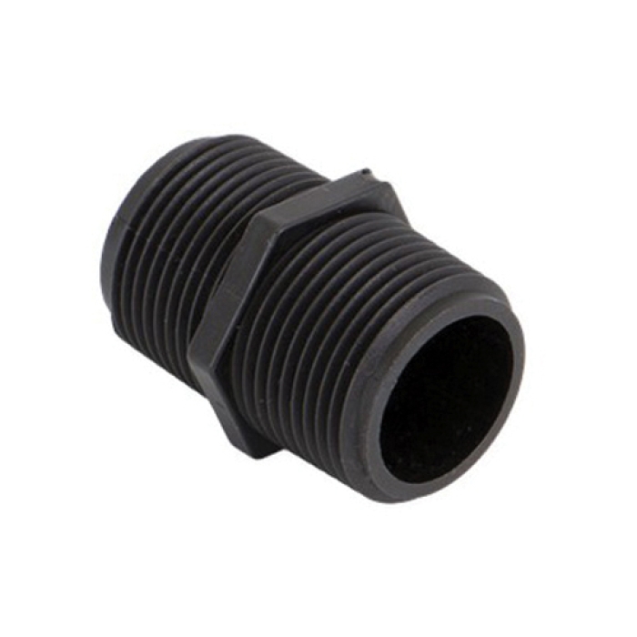 Banjo® Short Hex Nipple, Connection Type 1: NPT, Gender 1: Male, Connection Size 1: 1 in, Connection Type 2: NPT, Gender 2: Male, Connection Size 2: 1 in, SCH 80, 300 psi, Material Construction: Glass Reinforced Polypropylene, Black, 1.315 in Diameter, 2 in Length, -20 to 150 deg F