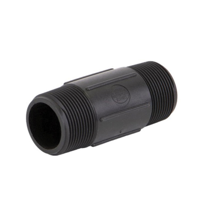 Banjo® Standard Pipe Nipple, Connection Type 1: NPT, Gender 1: Male, Connection Size 1: 1-1/4 in, Thread Size 1: 1-1/4-11-1/2, Connection Type 2: NPT, Gender 2: Male, Connection Size 2: 1-1/4 in, Thread Size 2: 1-1/4-11-1/2, SCH 80, 300 psi, Material Construction: Glass Reinforced Polypropylene, Black, 1-1/4 in ID x 1-3/4 in OD Diameter, 4 in Length, Hex Size: 1-3/4 in, -20 to 150 deg F