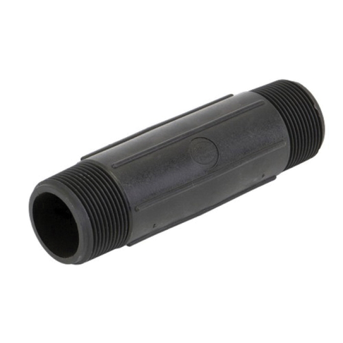 Banjo® Standard Pipe Nipple, Connection Type 1: NPT, Gender 1: Male, Connection Size 1: 1-1/4 in, Thread Size 1: 1-1/4-11-1/2, Connection Type 2: NPT, Gender 2: Male, Connection Size 2: 1-1/4 in, Thread Size 2: 1-1/4-11-1/2, SCH 80, 300 psi, Material Construction: Glass Reinforced Polypropylene, Black, 1-1/4 in ID x 1-3/4 in OD Diameter, 6 in Length, Hex Size: 1-3/4 in, -20 to 150 deg F