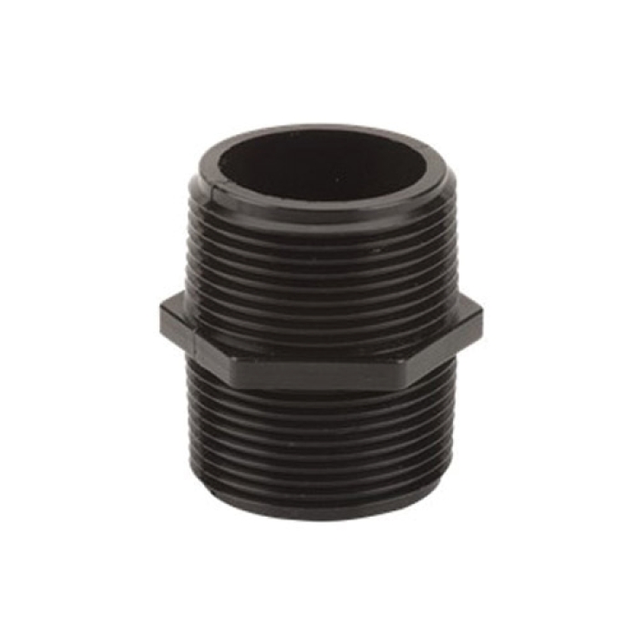 Banjo® Short Hex Nipple, Connection Type 1: NPT, Gender 1: Male, Connection Size 1: 1-1/4 in, Connection Type 2: NPT, Gender 2: Male, Connection Size 2: 1-1/4 in, SCH 80, 300 psi, Material Construction: Glass Reinforced Polypropylene, Black, 1.66 in Diameter, 2 in Length, -20 to 150 deg F