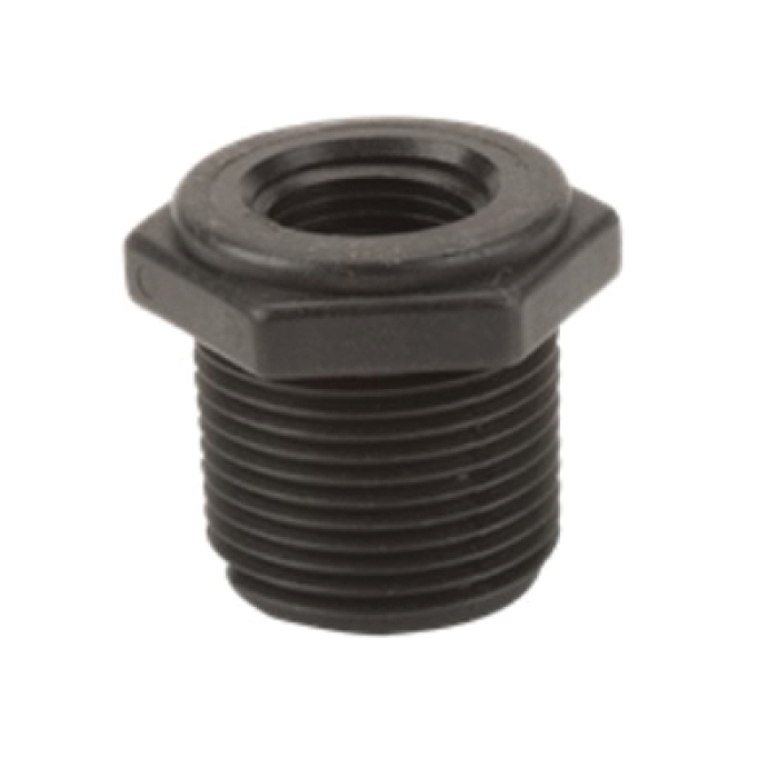 Banjo® Bushing, Connection Type 1: NPT, Gender 1: Male, Connection Size 1: 1 in, Thread Size 1: 1-11-1/2, Connection Type 2: NPT, Gender 2: Female, Connection Size 2: 1/2 in, Thread Size 2: 1/2-14, SCH 80, Hex Size: 1-9/16 in, 300 psi, Material Construction: Glass Reinforced Polypropylene, Black, Dimensions: 1-1/2 in L, -20 to 150 deg F