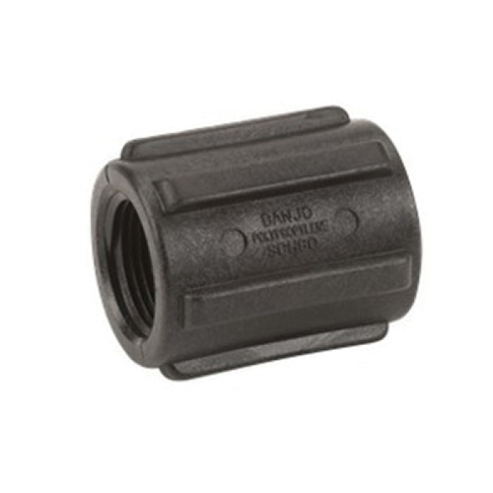 Banjo® Reducing Coupling, Connection Type 1: NPT, Gender 1: Female, Connection Size 1: 1 in, Connection Type 2: NPT, Gender 2: Female, Connection Size 2: 3/4 in, SCH 80, 300 psi, Material Construction: Glass Reinforced Polypropylene, Black, Dimensions: 2-1/4 in L, -20 to 150 deg F