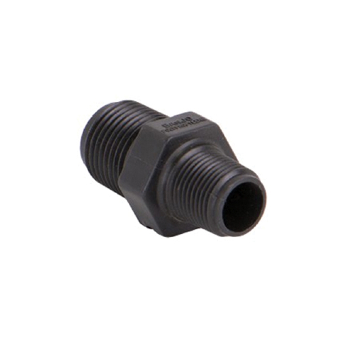 Banjo® Pipe Reducing Nipple, Connection Type 1: NPT, Gender 1: Male, Connection Size 1: 1/2 in, Thread Size 1: 1/2-14, Connection Type 2: NPT, Gender 2: Male, Connection Size 2: 3/8 in, Thread Size 2: 3/8-18, SCH 80, 300 psi, Material Construction: Glass Reinforced Polypropylene, Black, 9/16 x 1/2 in ID Diameter, 1-7/8 in Length, Hex Size: 1 in, -20 to 150 deg F
