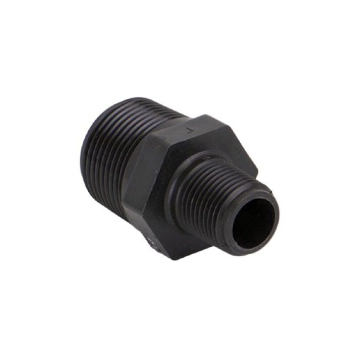 Banjo® Pipe Reducing Nipple, Connection Type 1: NPT, Gender 1: Male, Connection Size 1: 1 in, Thread Size 1: 1-11-1/2, Connection Type 2: NPT, Gender 2: Male, Connection Size 2: 1/2 in, Thread Size 2: 1/2-14, SCH 80, 300 psi, Material Construction: Glass Reinforced Polypropylene, Black, 7/8 x 9/16 in ID Diameter, 2-7/32 in Length, Hex Size: 1-3/8 in, -20 to 150 deg F