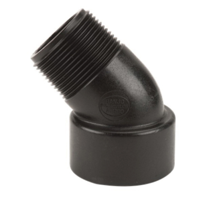 Banjo® 45 deg Street Elbow, Connection Type 1: NPT, Gender 1: Female, Connection Size 1: 1-1/4 in, Thread Size 1: 1-1/4-11-1/2, Connection Type 2: NPT, Gender 2: Male, Connection Size 2: 1-1/4 in, Thread Size 2: 1-1/4-11-1/2, 300 psi, SCH 80, Material Construction: Glass Reinforced Polypropylene, Black, -20 to 150 deg F