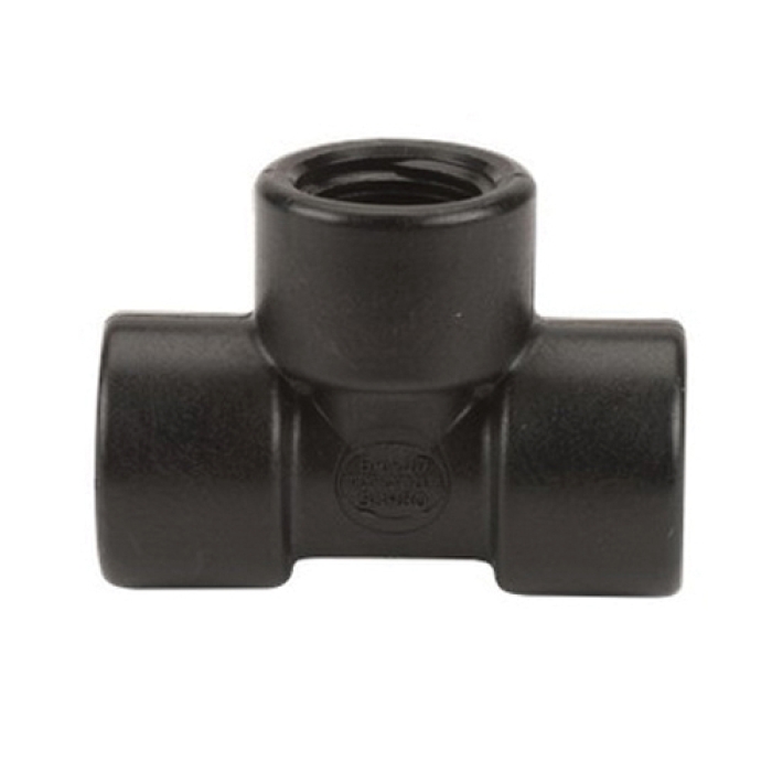 Banjo® Pipe Tee, Connection Type 1: NPT, Gender 1: Female, Connection Size 1: 3/4 in, Connection Type 2: NPT, Gender 2: Female, Connection Size 2: 3/4 in, Connection Type 3: NPT, Gender 3: Female, Connection Size 3: 3/4 in, SCH 80, 300 psi, Material Construction: Glass Reinforced Polypropylene, Black, Dimensions: 3-1/8 in L, -20 to 150 deg F