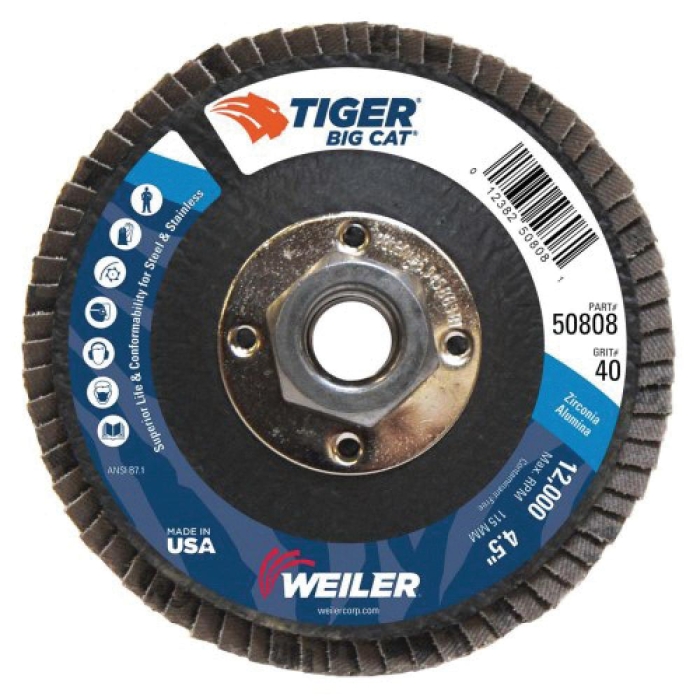 A thicker disc with larger flaps which conforms to curved and irregulars surfaces, resulting in a consistent finish Flap design results in 30 to 40% longer life than standard flap discs Thicker phenolic back provides more stability for the thicker cloth configuration Self-sharpening zirconia alumina grains hold up under high temperatures and extreme pressure 5/8-11 metal nut allows for quick spin-on, spin-off changeover and eliminates cross-threading or sticking to spindle due to heat build-up Tiger® Big Cat® 4-1/2 in type 27 high density flap discs offer the widest footprint in the industry for grinding steel and stainless steel The wider flaps in combination with the thicker high density profile conforms to curved and irregular surfaces better, producing a consistent finish and lasting 30 to 40% longer than a standard density flap disc The high density flap design is conformable to irregular surfaces when grinding between 0 to 15 deg while the 40 grit abrasive grain is best for edge beveling, chamfering, weld grinding and blending with a right angle grinder This disc offers a metal 5/8-11 nut that allows for quick-changeovers and prevents the disc from sticking to the spindle
