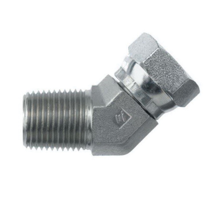 Brennan 45 deg Elbow, Series: 1503, Connection Type 1: NPTF, Gender 1: Male, Connection Size 1: 1/2 in, Thread Size 1: 1/2-14, Connection Type 2: NPSM Swivel, Gender 2: Female, Connection Size 2: 1/2 in, Thread Size 2: 1/2-14, Hex Size: 1 in, Dimension Standards: SAE 140330, 3500 psi, Material Construction: Forged Steel