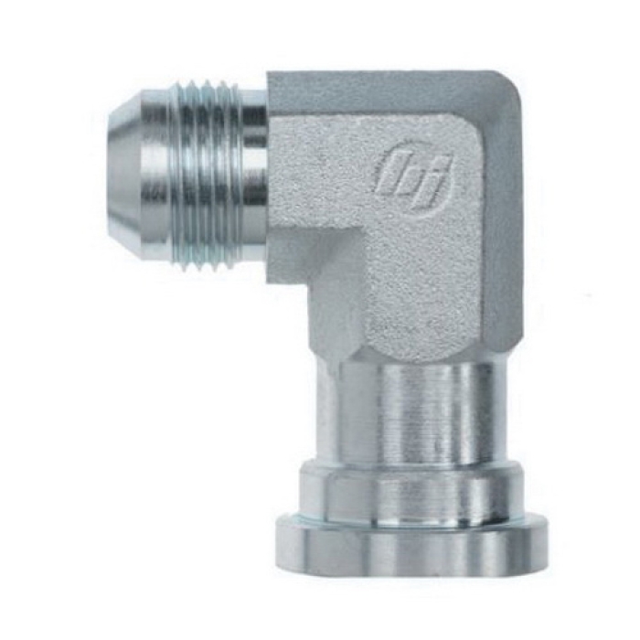 Brennan 90 deg Elbow, Series: 1704-FG, Connection Type 1: SAE Code 61 Flange, Connection Size 1: 3/4 in, Connection Type 2: JIC, Gender 2: Male, Connection Size 2: 3/4 in, Thread Size 2: 1-1/16-12 UN, Hex Size: 1-1/8 in, Material Construction: Forged Steel