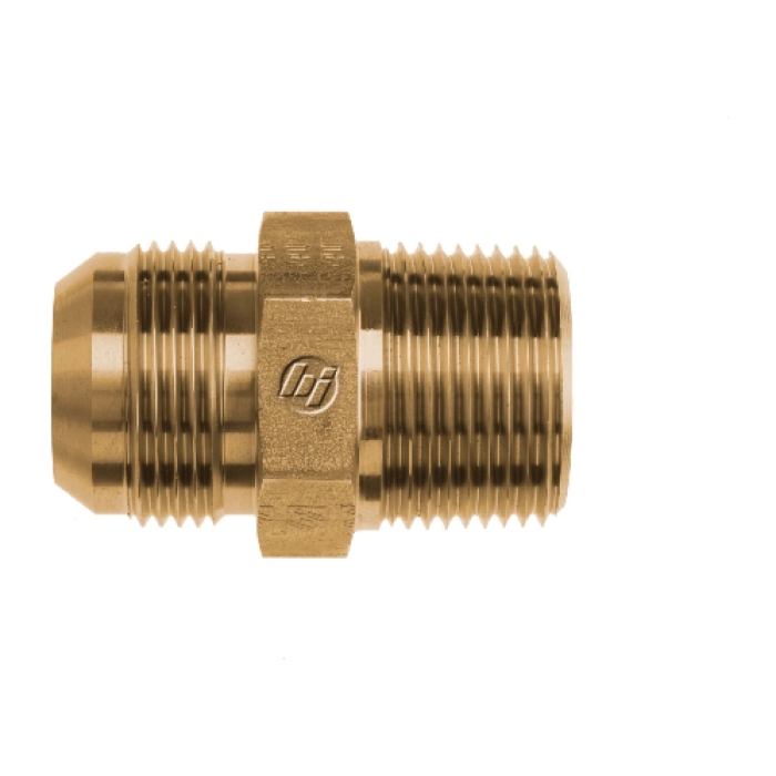 Brennan Straight Adapter, Series: 2404, Connection Type 1: SAE 37 deg JIC Flare, Gender 1: Male, Connection Size 1: 1 in, Thread Size 1: 1-5/16-12, Connection Type 2: NPTF, Gender 2: Male, Connection Size 2: 1 in, Thread Size 2: 1-11-1/2, Hex Size: 1-3/8 in, Dimension Standards: SAE 070102, MS 51500, 3300 psi, Material Construction: Brass, 2.3 in Length