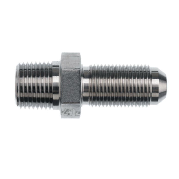 Brennan Bulkhead Straight Adapter, Series: 2706, Connection Type 1: SAE 37 deg JIC Flare, Gender 1: Male, Connection Size 1: 3/8 in, Thread Size 1: 9/16-18, Connection Type 2: NPTF, Gender 2: Male, Connection Size 2: 1/4 in, Thread Size 2: 1/4-18, Hex Size: 0.812 in, 6000 psi, Material Construction: Steel, 2.19 in Length