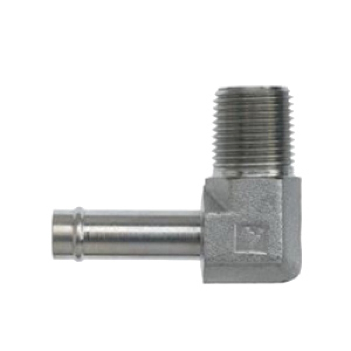 Brennan 90 deg Elbow, Series: 4501, Connection Type 1: Hose Barb, Connection Size 1: 1 in, Connection Type 2: NPTF, Gender 2: Male, Connection Size 2: 3/4 in, Thread Size 2: 3/4-14, Hex Size: 1.312 in, Material Construction: Steel