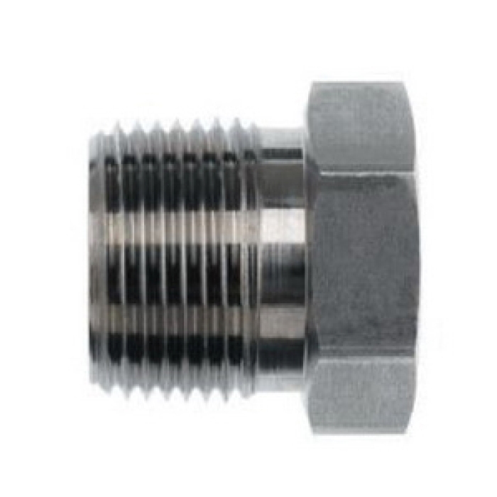 Brennan Straight Reducer Bushing, Series: 5406, Connection Type 1: NPTF, Gender 1: Male, Connection Size 1: 1 in, Thread Size 1: 1-11-1/2, Connection Type 2: NPTF, Gender 2: Female, Connection Size 2: 3/4 in, Thread Size 2: 3/4-14, Hex Size: 1-3/8 in, Dimension Standards: SAE 140140, 4800 psi, Material Construction: Stainless Steel, 1.36 in Length