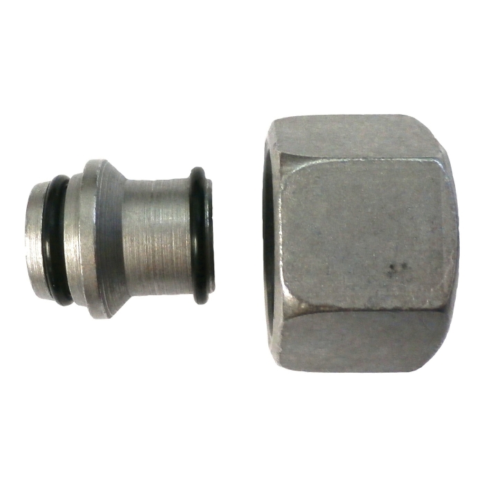 Brennan Light-Duty Cap and Nut, Series: D8003, Connection Type 1: Metric Bite DIN Tube, Connection Size 1: 28 mm, Thread Size 1: M36 x 2, Hex Size: 41 mm, Dimension Standards: DIN 2353, ISO 8434-1, Material Construction: Steel, 25.5 mm Length