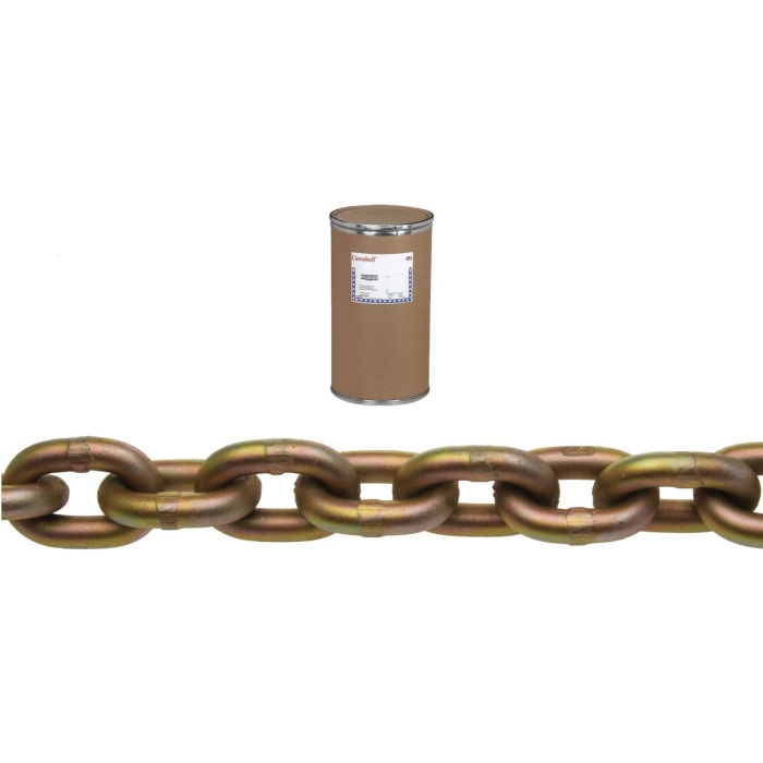 Campbell® Transport Chain, 1/2 in Trade, Load Capacity: 11300 lb, Grade: 70, Material Construction: Carbon Steel, Finish: Yellow Chromate Zinc Electroplated, Inside Length: 1.7 in, Inside Width: 3/4 in, 200 ft Length, For Use With: Load Binding, Towing, Logging, Package Type: Drum