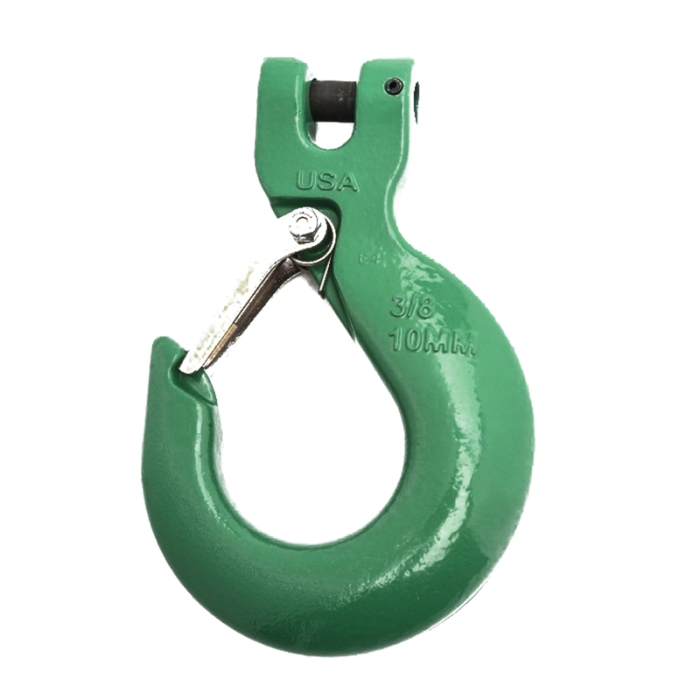 Campbell® Quik-Alloy® Sling Hook with Latch, 3/8 in Trade, Load Capacity: 8800 lb, Grade: 100, Hook Opening: 1-5/16 in, Attachment Type: Clevis, Jaws, 7/16 in Eye Diameter, Material Construction: Alloy Steel, Finish: Painted, Green, Dimensions: 4-1/2 in W, For Use With: Grade 80/100 Chain Sling