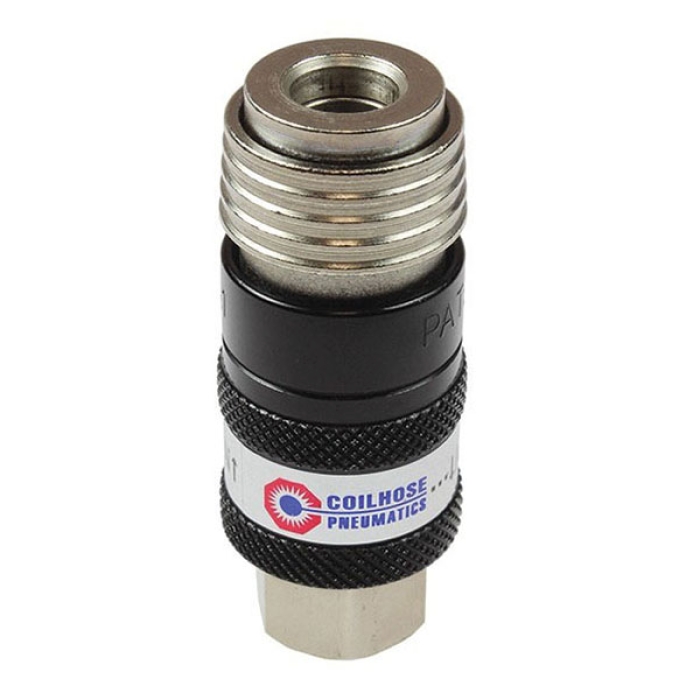 Coilhose® 5-in-1 Universal Safety Exhaust Coupler, Connection Type 1: Quick Disconnect, Connection Size 1: 1/4 in, Connection Type 2: NPT, Gender 2: Female, Connection Size 2: 1/4 in, Material Construction: Aluminum/Steel, Finish: Chrome-Plated