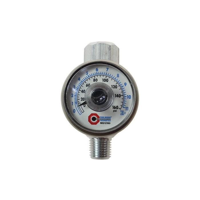 Coilhose® In-Line Flow Regulator, Inlet Pipe Size: 1/4 in, 150 psi, 175 deg F, Material Construction: Aluminum, Dimensions: 0.75 in Hex Dia x 1.87 in L, Includes: 0 - 160 psi 1-1/2 in Dial Gauge, Display