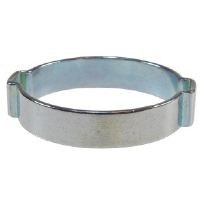 Zinc-plated ear clamps are used in the installation of low and medium pressure hose connections. The double ear design creates a spring like connection that assists in maintaining an enduring connection, even when the hose expands and contracts. Proper installation consists of pinching one ear fully, then pinching the second ear fully closed. This allows for the first ear to open slightly, creating a spring like clamping force.