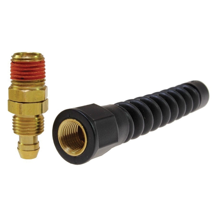 Strain relief fittings are reusable and prevent kinking at the connection. The brass fittings are machined from quality hex stock. The hose fits inside of the strain relief completely and offers an exceptional bend radius without the loss of flow. The strain reliefs have a brass threaded insert that is integral with the fitting, and is inserted during the molding process. This means that the insert is permanently installed and completely integrated into the assembly.