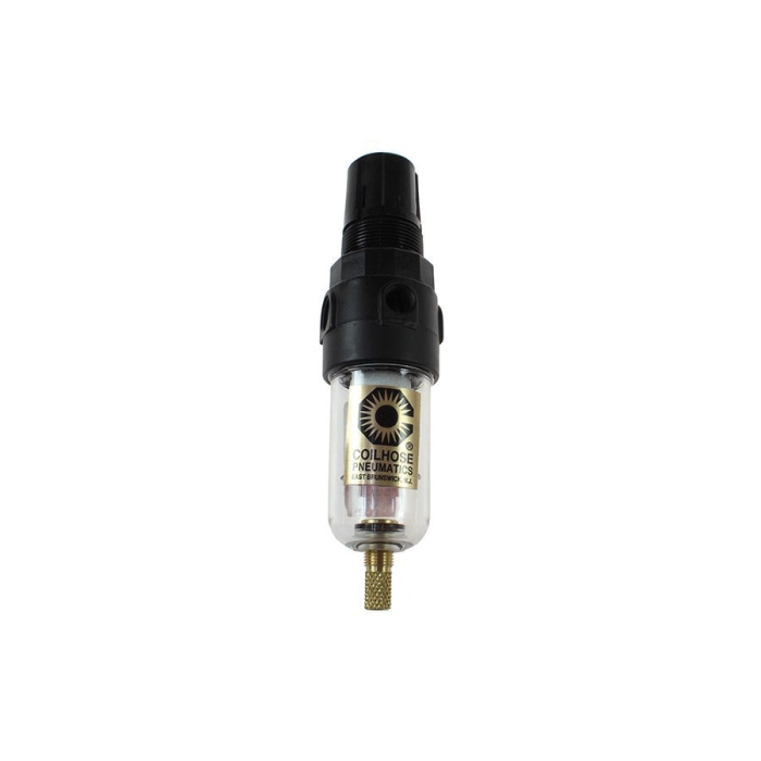Coilhose® Miniature Integral Filter/Regulator, Inlet Pipe Size: 1/4 in, Pressure Regulating Range: 5 - 125 psi, 150 psi, Remove Down Particle Size: 5 um, Polycarbonate Bowl