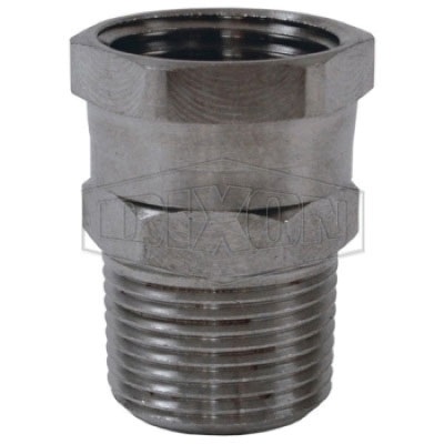 Dixon® Adapter, Connection Type 1: GHT Swivel, Gender 1: Female, Connection Size 1: 3/4 in, Thread Size 1: 3/4-11-1/2, Connection Type 2: NPTF, Gender 2: Male, Connection Size 2: 1/2 in, Thread Size 2: 1/2-14, Hex Size: 1-3/16 in, Material Construction: 303 Stainless Steel, Dimensions: 1.63 in L, 34 - 195 deg F